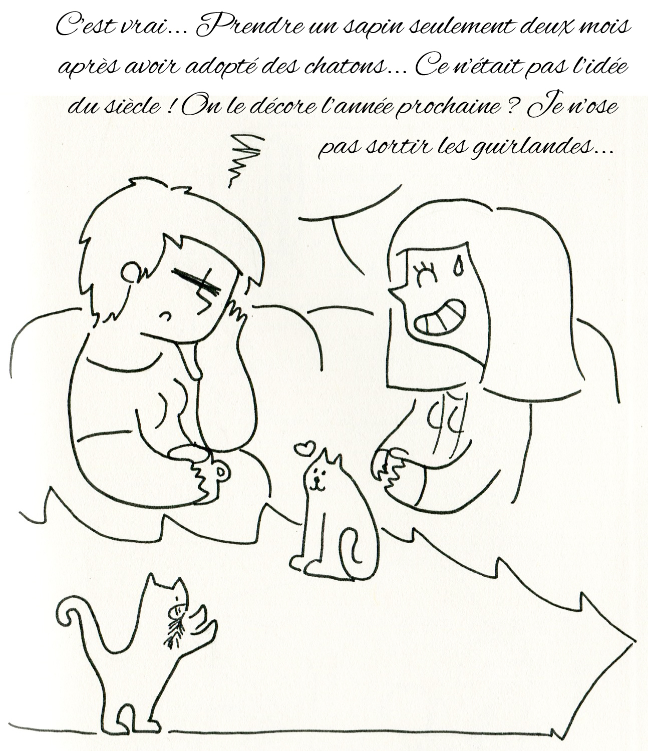 1. Viiiiiiiite la prochaine bd ! J’adore ! Et sinon bah… j’ai pas fait de sapin, juste des décos en origami sur un bougeoir mural, et ça les intéresse déjà bien assez comme ça ! ^^