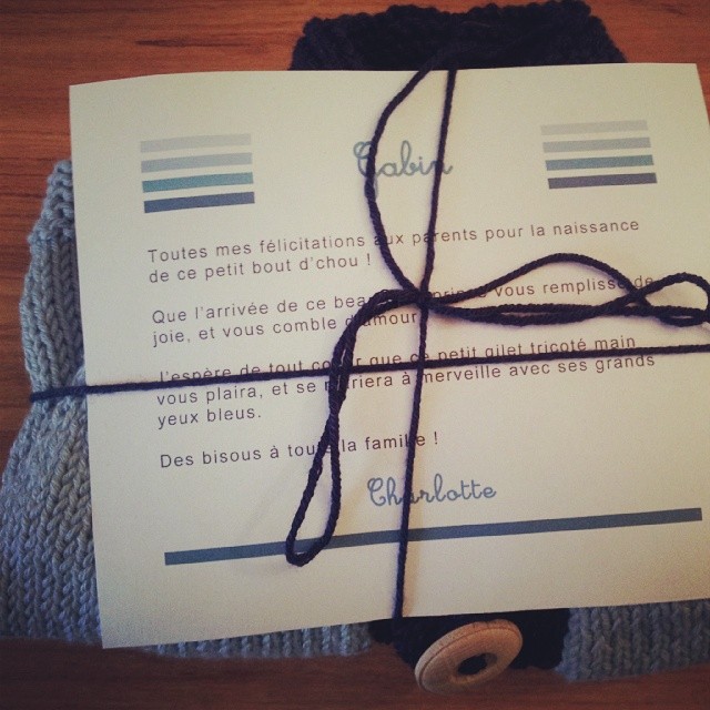 HIIIIIIIIIIIIIIIIIIIIII Mélanie vient de m’envoyer une photo de son petit Gabin avec mon gilet ! Je foooonnnnd, c’est tellement adorable ! J’ai envie de faire des bébés juste pour tricoter de la layette, tiens…