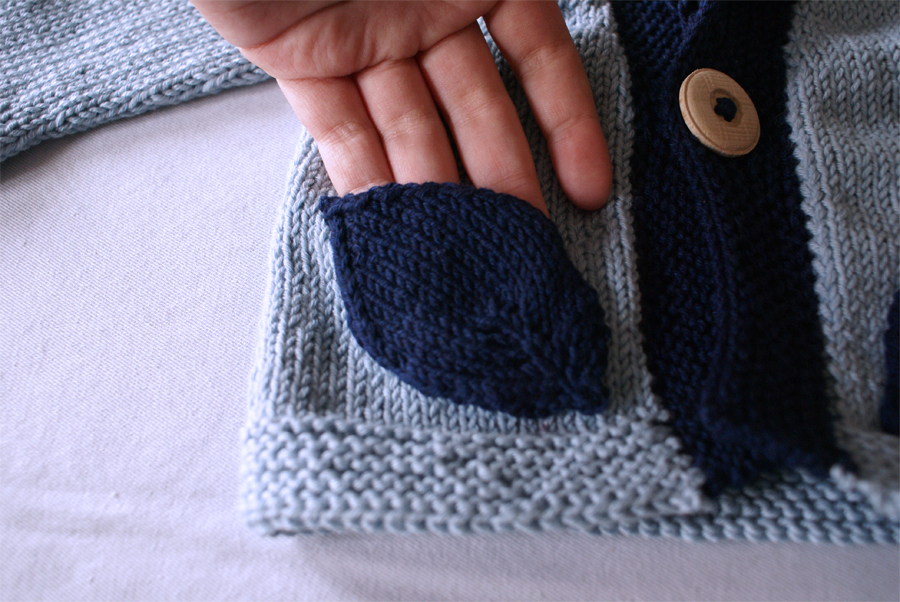 Je n’ai pas cherché longtemps pour trouver un modèle, ça faisait des mois qu’il était dans mes favoris ! Ce qui m’a fait craquer ? Ses petites poches en forme de feuilles. ADORABLES ! J’ai adoré le tricoter, surtout que le gilet est en une seule pièce, c’est tellement agréable à faire.