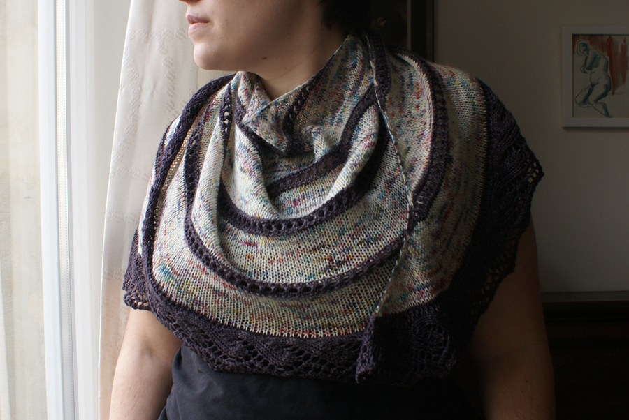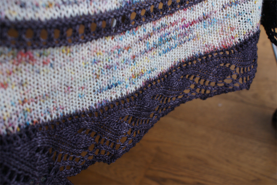 Les derniers rangs sont toujours interminables mais ça en vaut la peine. J’aime bien tricoter des châles parce que c’est des projets sûrs, la laine est mise en valeur et pas de problème de taille.