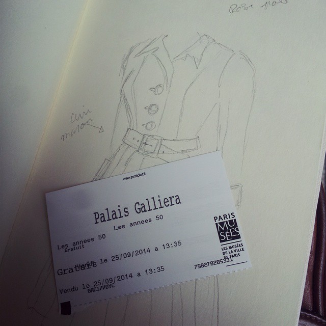 Il y a un mois, je suis allée voir la sublime exposition « Les Années 50 » au Palais Galliera (musée de la mode de la ville de Paris). J’en avais entendu beaucoup de bien, et puis bon, il ne me faut pas grand chose pour me motiver à aller voir des jolies robes ! Mais on m’avait dit que les photos étaient interdites, du coup j’avais prévu d’y aller avec mon carnet et mon crayon, histoire d’avoir des souvenirs. Pourtant, en arrivant là-bas, j’ai failli de pas sortir mon carnet… Quand je suis tombée nez à nez avec toutes ces robes plus magnifiques les unes que les autres, je me suis dis que je ne serais jamais à la hauteur pour les dessiner…! Mais j’ai repris mes esprits en me disant que ça serait vraiment bête de ne pas avoir une trace de cette expo, et qui sait ? Je trouverai peut être de l’inspiration pour mes futures robes…