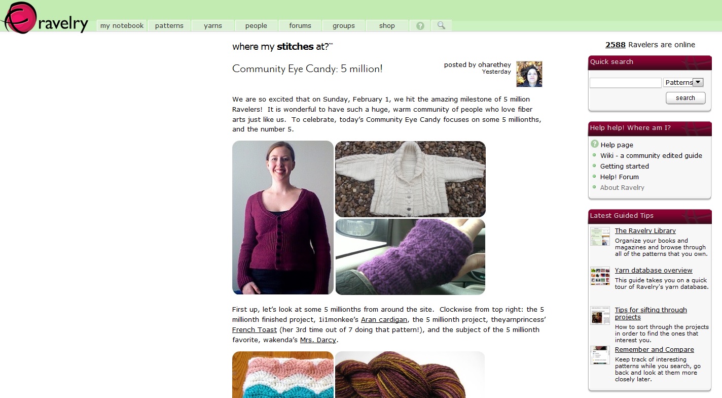 Bon, en détails, ça donne ça : la plus grande bibliothèque de patrons en ligne, bibliothèque des laines, forum, espaces communautaires, création de son profil, mettre en ligne ses projets… Bref, ce site est incontournable si on veut tricoter autre chose que du Phild*r (Attention, Phild*r est une marque très sympa, néanmoins ça me gonfle de ne trouver QUE ça en France !)