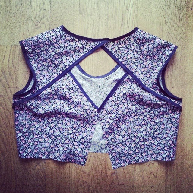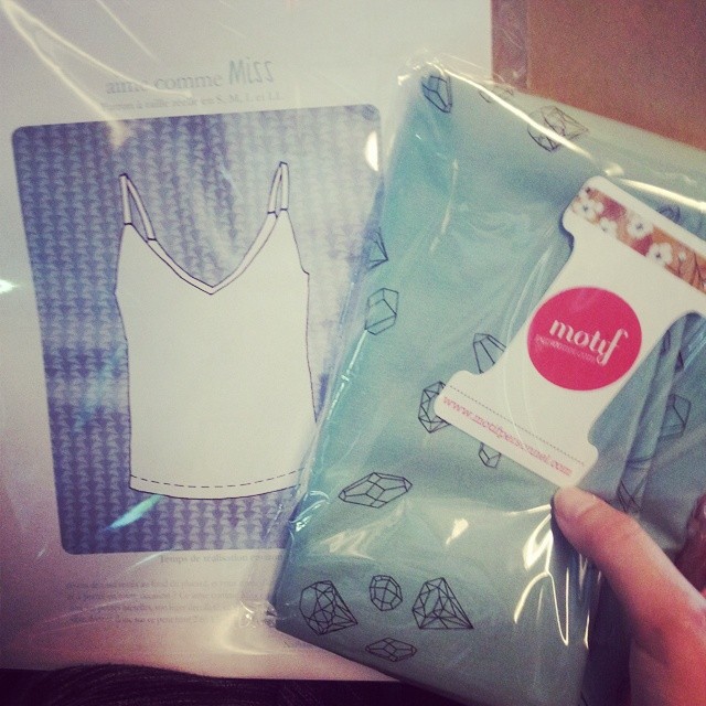 Une fois rentrée chez moi, quelle est la première chose que je fais ? Je déballe tout, je lave mes tissus et… Quoi ? Attendre ? Heuuu vous me connaissez mal là ! J’ai donc décidé de faire une version test de Aime comme Miss, avant de massacrer découper mon super tissu à diamants. ET J’AI BIEN FAIT ! J’ai utilisé mon reste de tissu ancres de mon tote bag, j’ai élargi au niveau des hanches (poignées d’amour bonjouuuuuuuur) et je me suis rendue compte que les fines bretelles ne cachaient pas assez mon soutien gorge. J’ai aussi pas mal galéré à l’étape 6-7, je trouve que les dessins ne sont pas explicites et les explications pas très claires. J’ai du recommencé deux fois le montage de l’arrière (donc heureusement que ce n’était pas mon coupon chéri avec les gros cailloux !)
